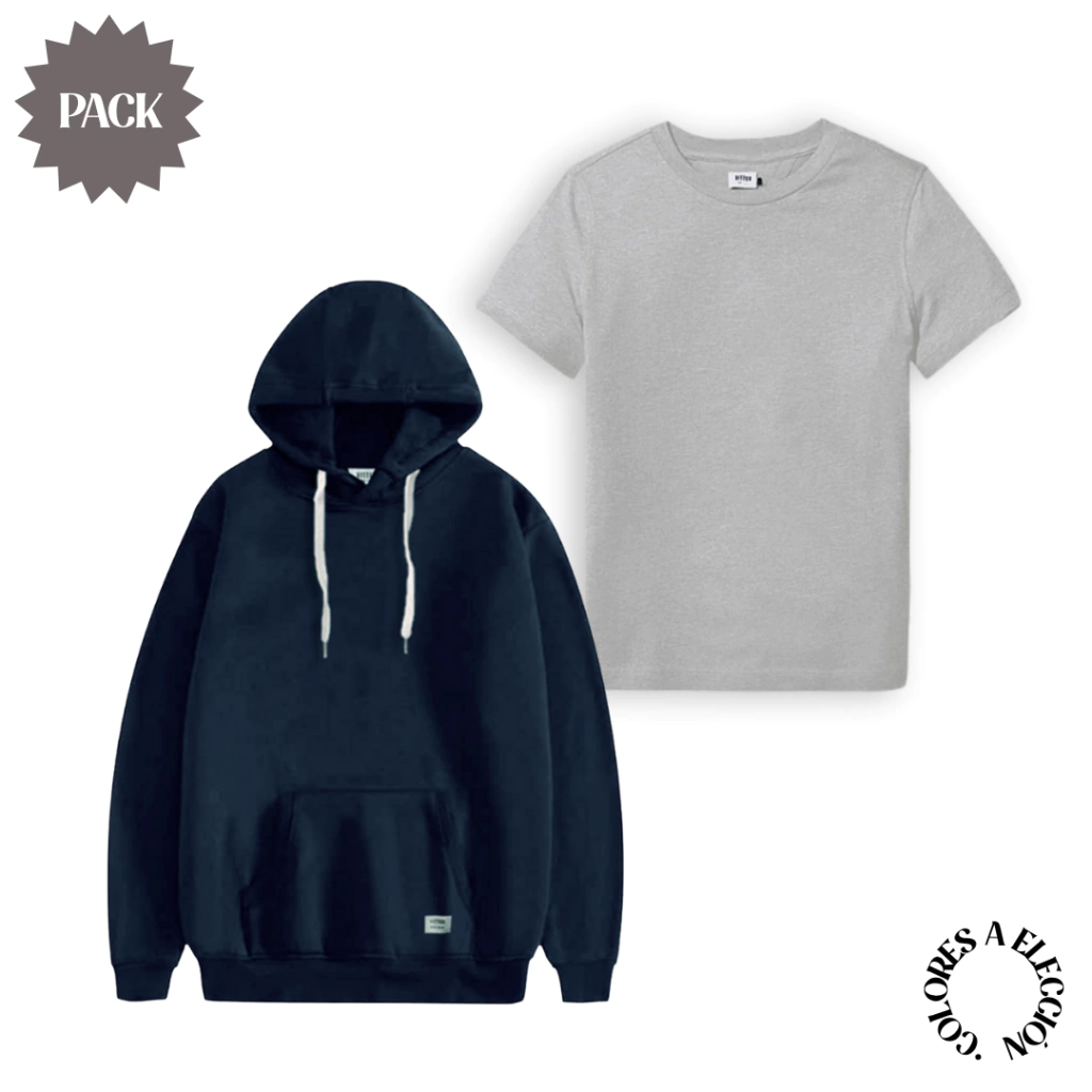 Este pack es la manera más fácil y económica de renovar tu estilo. Trae un buzo canguro impresidible en cualquier placard, calentito con capucha y una remera básica hechas con el mejor algodón 24/1 peinado.